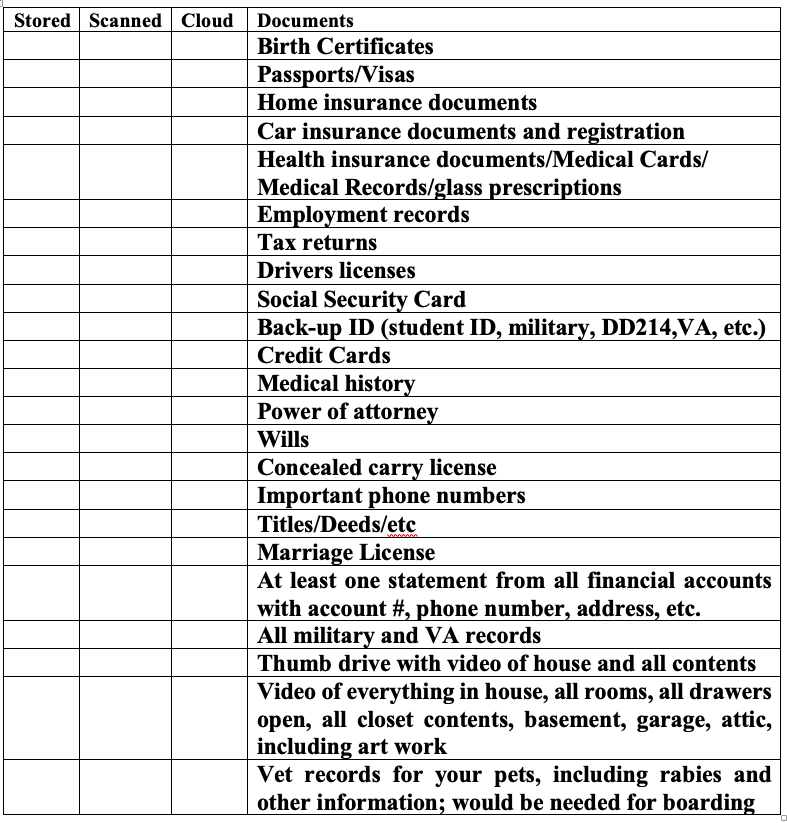 I want to remind people that my Preparation and Survival Guide is the best way to prepare for emergencies in an easy, step by step manner. Below is a list of documents you should collect and put in a fire/water proof lock box that you can grab and take with you if you have to evacuate. Also, I recommend scanning all the documents and loading them in a secure place in the cloud.